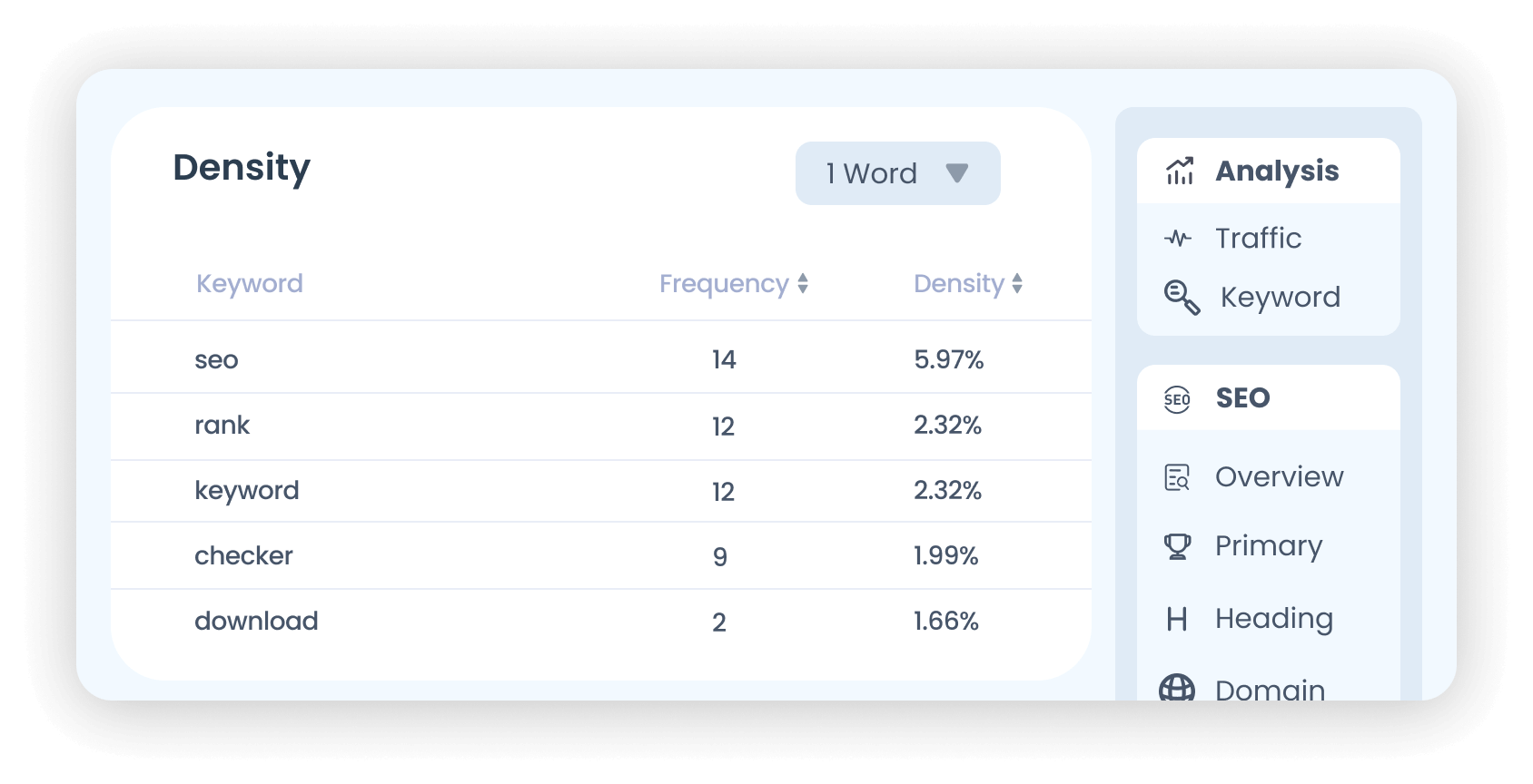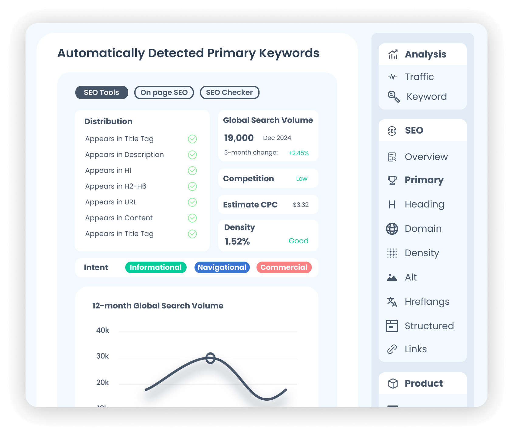 Automatically detect the main keywords on the page, see where they appear (title, meta, headings, URL, content), and get suggested keywords.