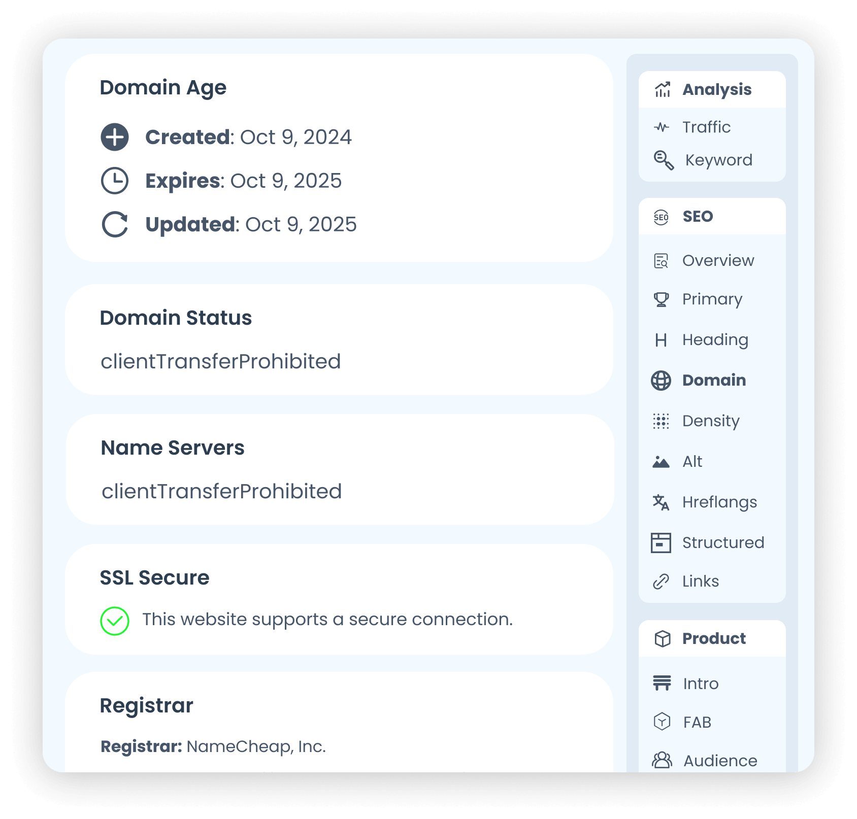 View indexed pages, domain age, status, name servers, SSL security, and registrar details.