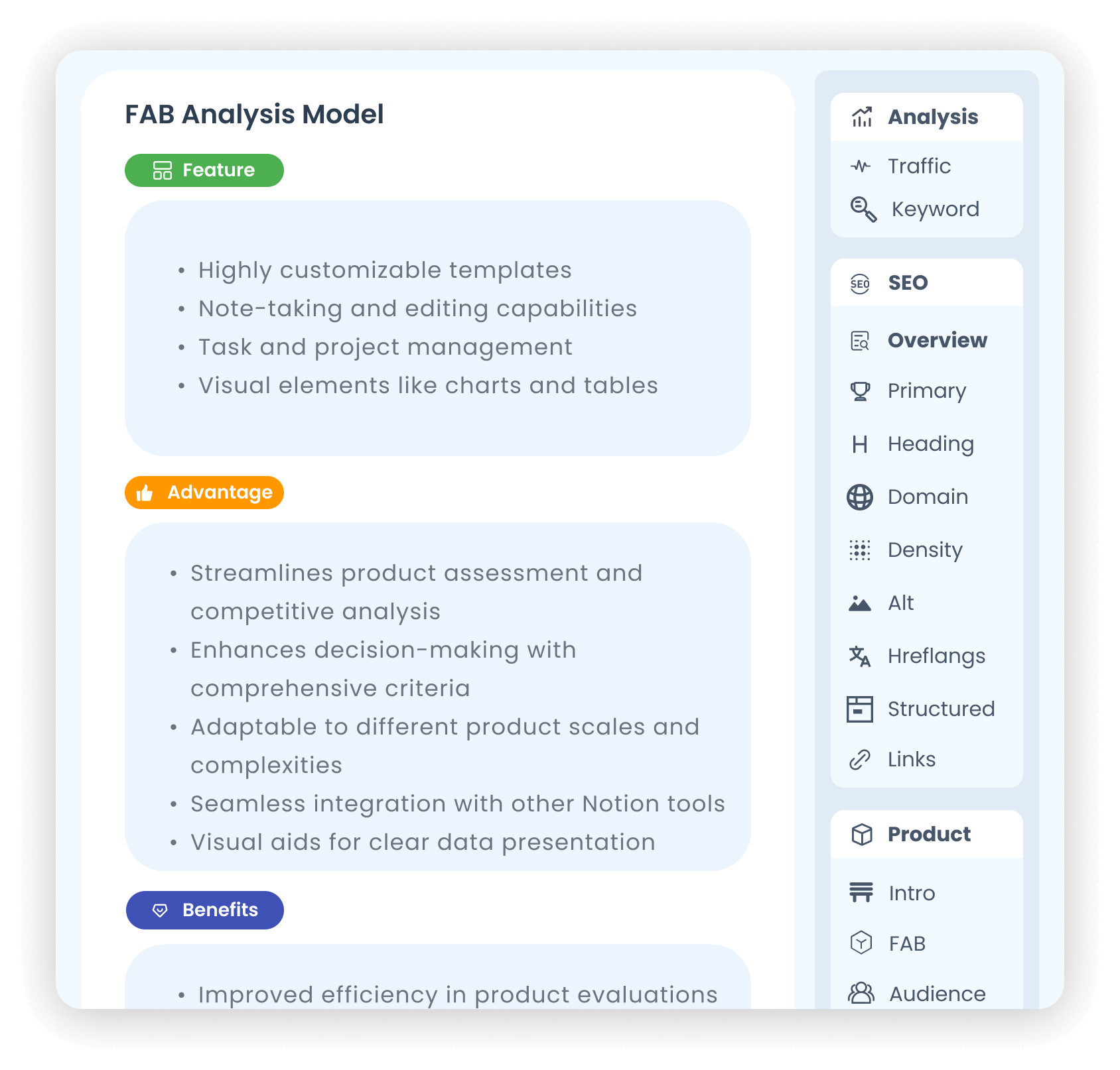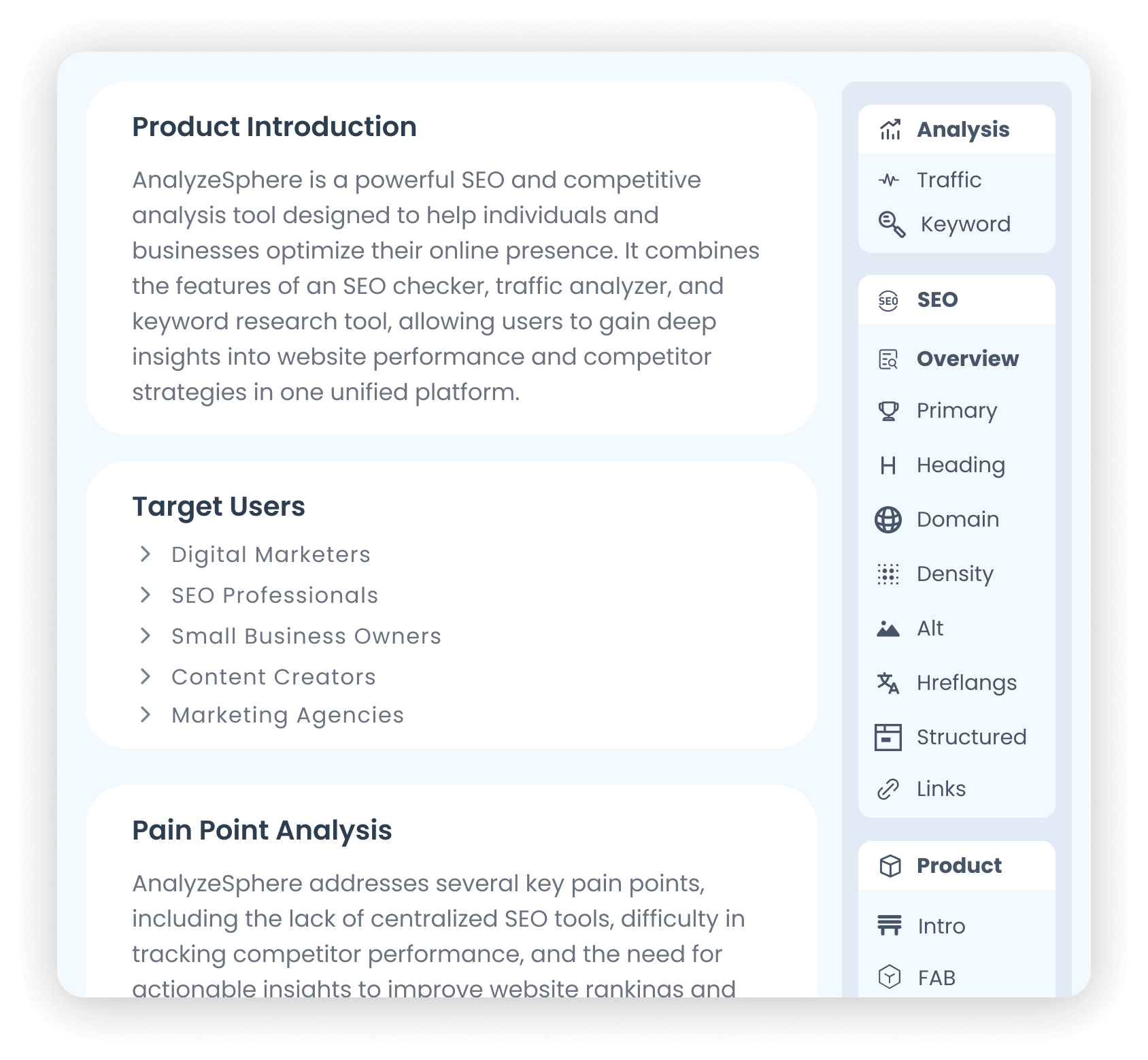 Get a quick overview of the site/product, including target users, pain points, solutions, business model, and market positioning.