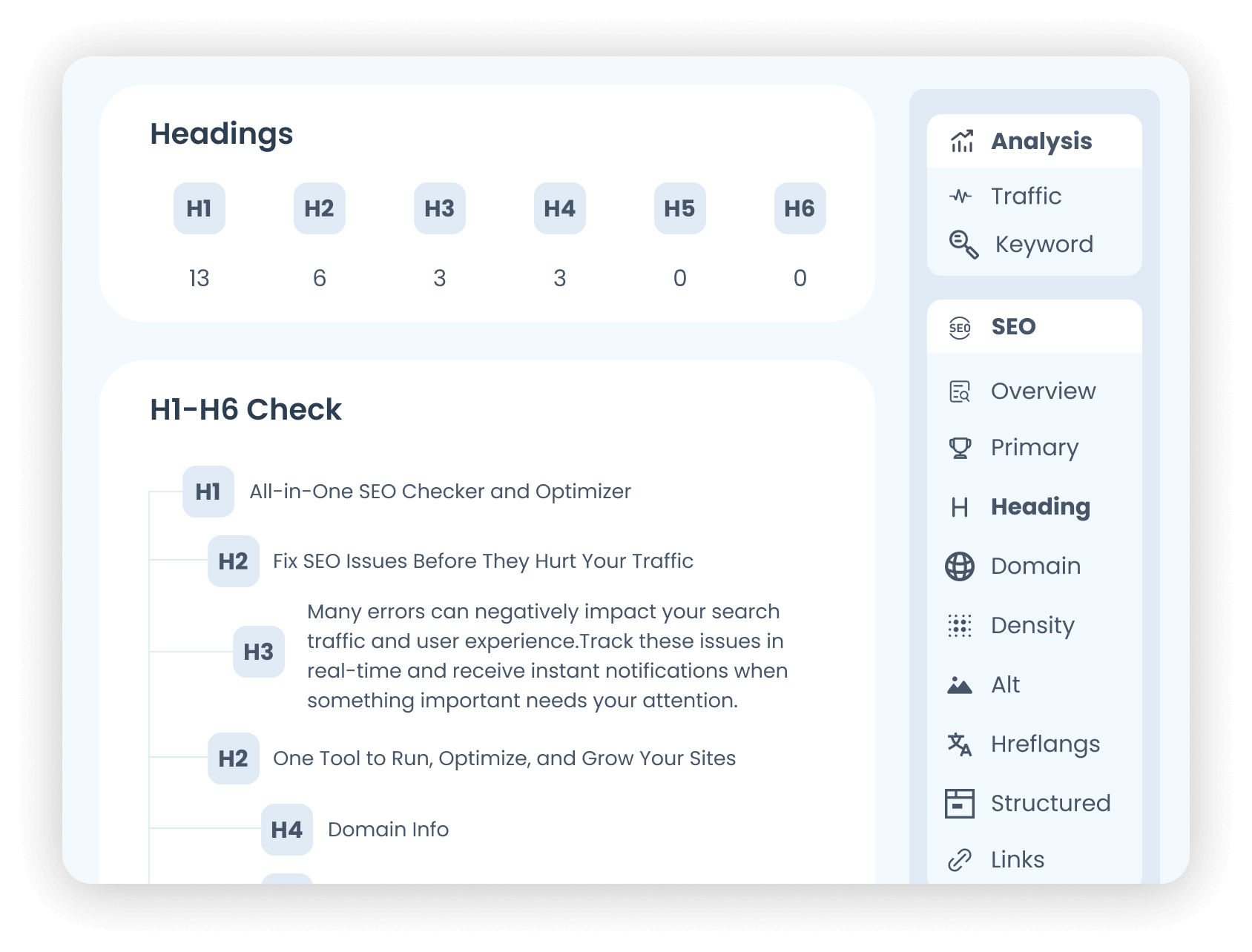 Quickly scan all H1-H6 tags to ensure your content is well-structured and optimized for SEO.