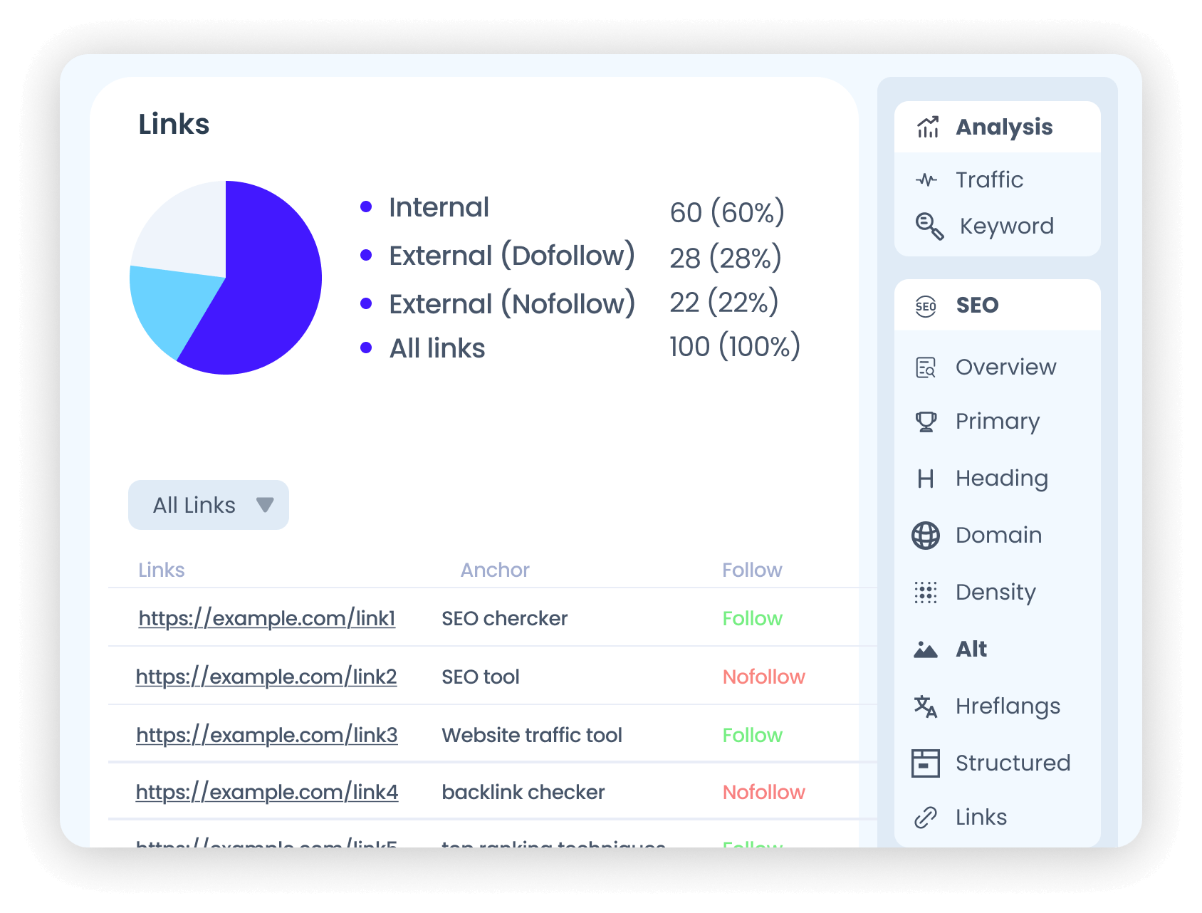 See all links on the page, their anchors, and whether they’re follow/no-follow.